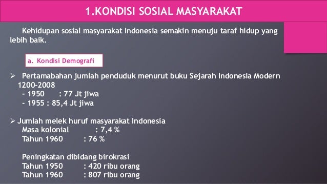 Rangkuman perkembangan ekonomi indonesia pada masa kemerdekaan. Masa ini berlangsung mulai 17 agustus 1950. Indonesia pada masa demokrasi terpimpin. Kehidupan masyarakat indonesia pada masa demokrasi terpimpin. Gambaran kehidupan masyarakat indonesia pada masa demokrasi termpimpin dapat dilihat dari beberapa aspek.